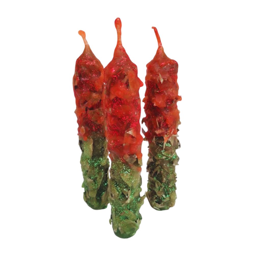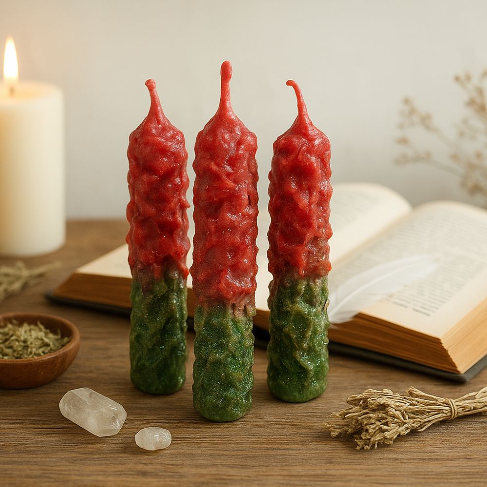 Este set de tres velas alquímicas fue creado para desbloquear energías estancadas, activar la fuerza personal y abrir caminos en lo material y lo espiritual. Cargadas con una mezcla de hierbas esotéricas menta, eucalipto y un toque de magia intencionada, combinan los colores verde (prosperidad y avance) y rojo (acción y poder) para potenciar su efecto.
